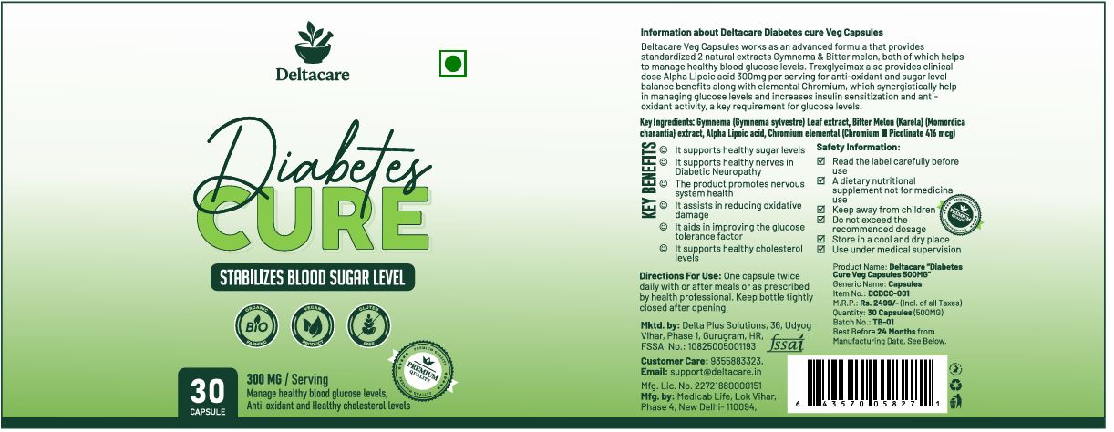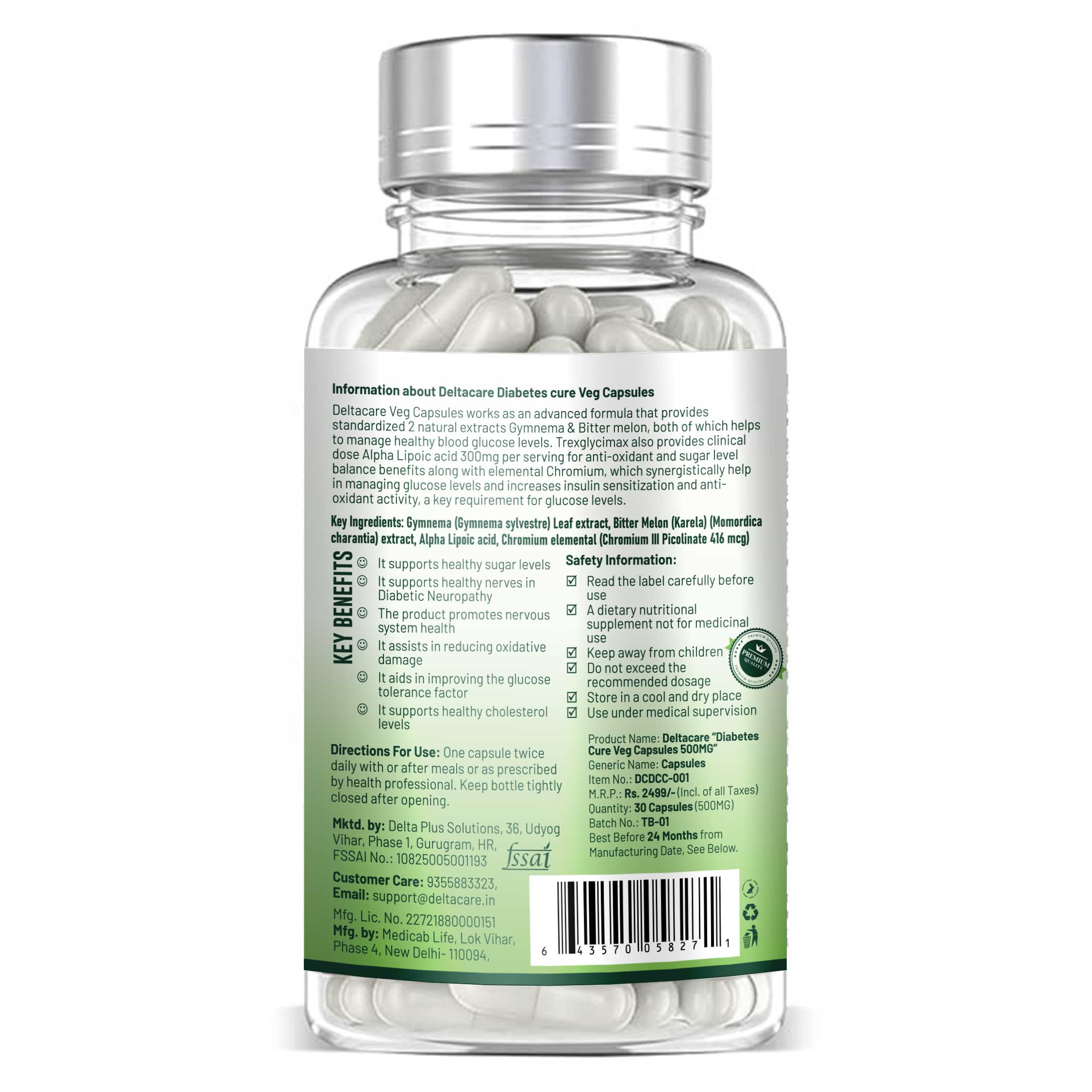 Deltacare Veg Capsules works as an advanced formula that provides standardized 2 natural extracts Gymnema & Bitter melon, both of which helps to manage healthy blood glucose levels. Trexglycimax also provides clinical dose Alpha Lipoic acid 300mg per serving for anti-oxidant and sugar level balance benefits along with elemental Chromium, which synergistically help in managing glucose levels and increases insulin sensitization and anti-oxidant activity, a key requirement for glucose levels.
