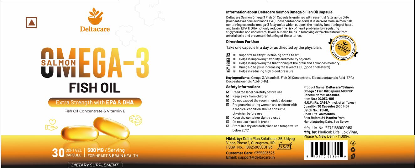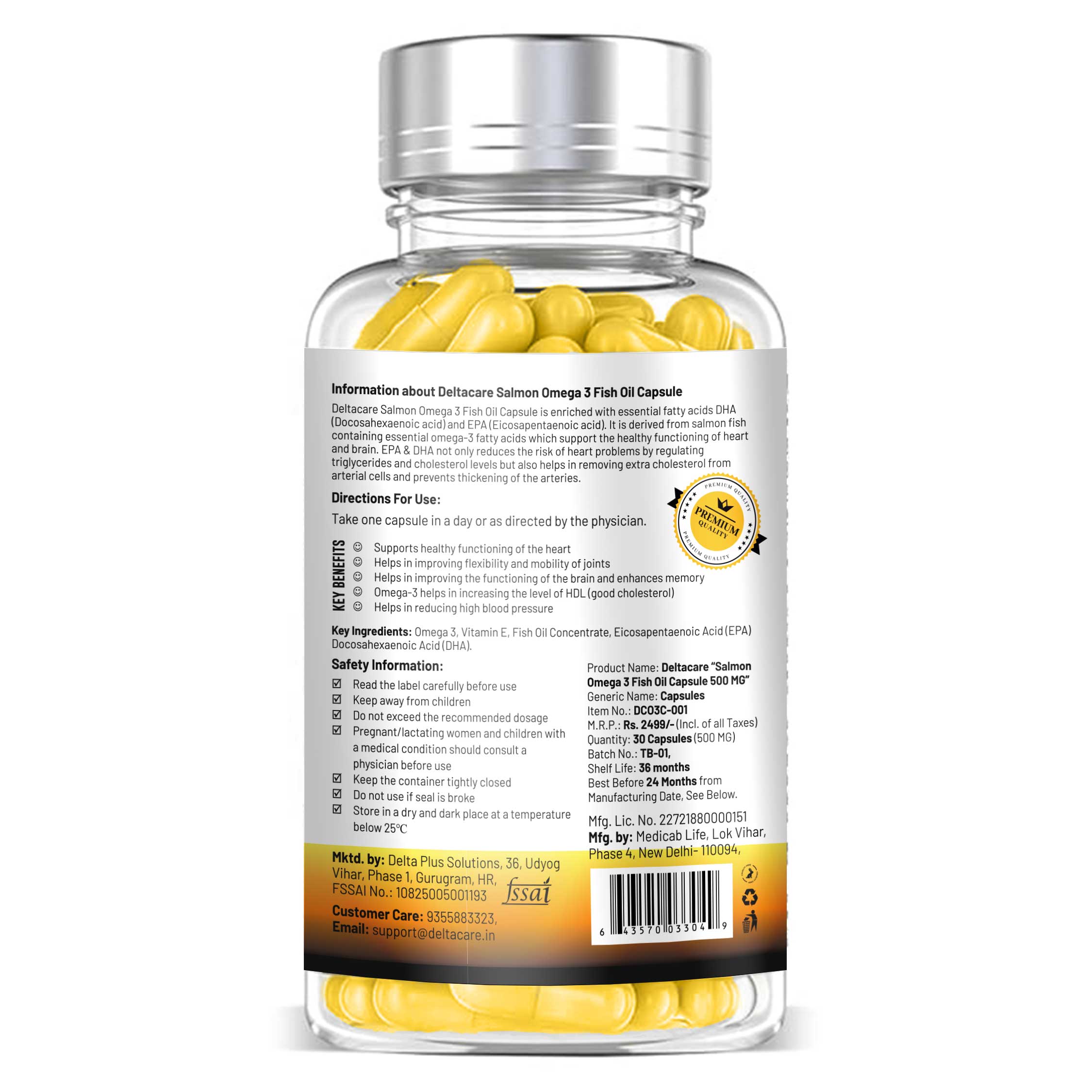 Deltacare Omega 3 Capsule is enriched with essential fatty acids DHA (Docosahexaenoic acid) and EPA (Eicosapentaenoic acid). It is derived from salmon fish containing essential omega-3 fatty acids which support the healthy functioning of heart and brain. EPA & DHA not only reduces the risk of heart problems by regulating triglycerides and cholesterol levels but also helps in removing extra cholesterol from arterial cells and prevents thickening of the arteries.